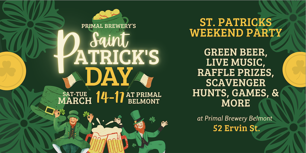 Join us March 14, 15 & 17 for a three-day celebration at Primal Brewery Belmont! We’ll have green beer, pizza from @tapsidepizza, scavenger hunts, raffle prizes, games, and plenty of shenanigans.