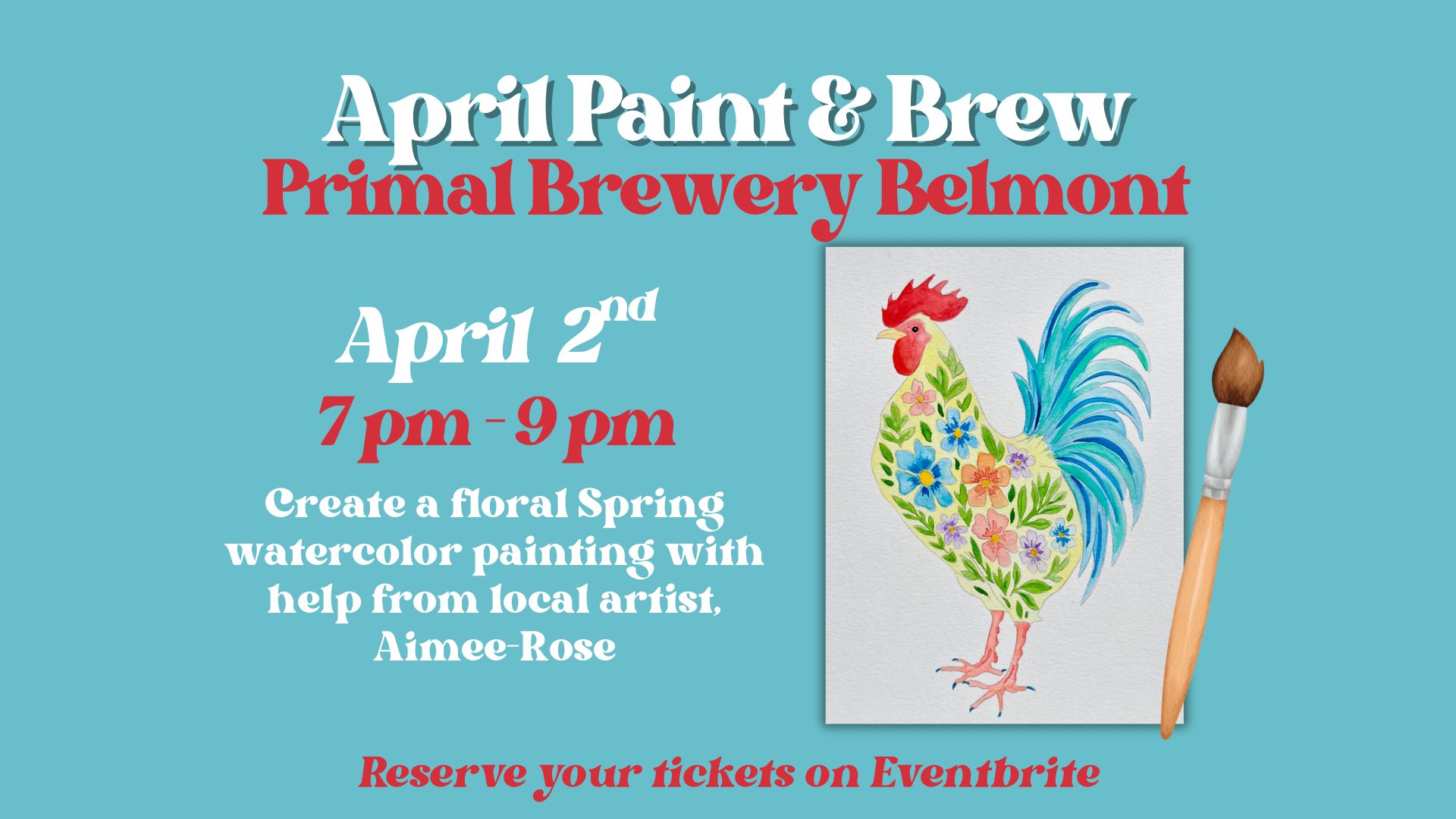 Join local artist Aimee-Rose of Art by Aimee-Rose for a fun and relaxing Paint & Brew night at Primal Brewery in Belmont! In this guided class, you’ll create a charming spring floral rooster watercolor painting perfect for celebrating the season.
